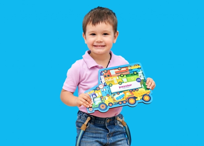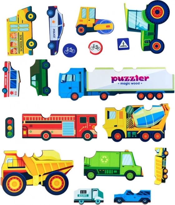 - 18 pezzi illustrati – auto, ambulanza, veicolo dei pompieri o della polizia, autobus e segnali stradali.