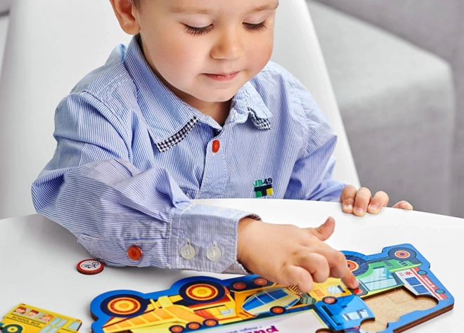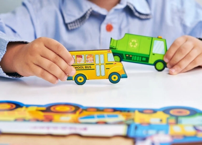 Ogni pezzo raffigura un diverso mezzo di trasporto o un segnale, così i bambini acquisiscono facilmente nuovi concetti e ampliano il vocabolario.