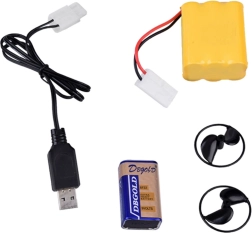 • Set completo: radiocomando a forma di timone, batteria, batteria da 9 V, cavo USB, eliche di ricambio e supporto.
