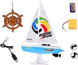 Elegante barca a vela RC in blu e bianco con vele realistiche che offre ai bambini tanto divertimento in acqua. Il controllo è affidato a un radiocomando a volante sulla frequenza 27 MHz; non mancano doppie eliche, chiglia stabilizzante, corrimano cromati e supporto per l’esposizione. La confezione include batteria ricaricabile, cavo USB e eliche di ricambio.