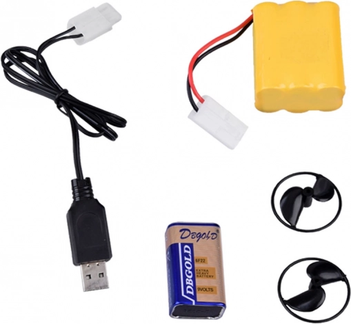 Inclusi batteria da 7,2 V, batteria da 9 V per il radiocomando, cavo di ricarica USB, eliche di ricambio e pratico supporto.