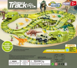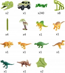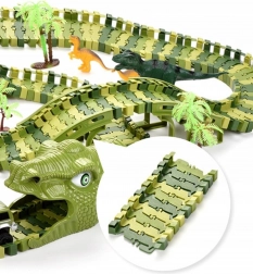Costruisci per i bambini un mondo di avventure preistoriche. Il set contiene tutto il necessario per un gioco lungo e creativo: pista verde modulare, 8 dinosauri (inclusi 2 grandi), 2 gallerie a forma di testa di dinosauro, ponti, alberelli e una macchinina elettrica alimentata da batteria AA. I pezzi si incastrano facilmente per creare un circuito in cui la macchinina corre da sola.