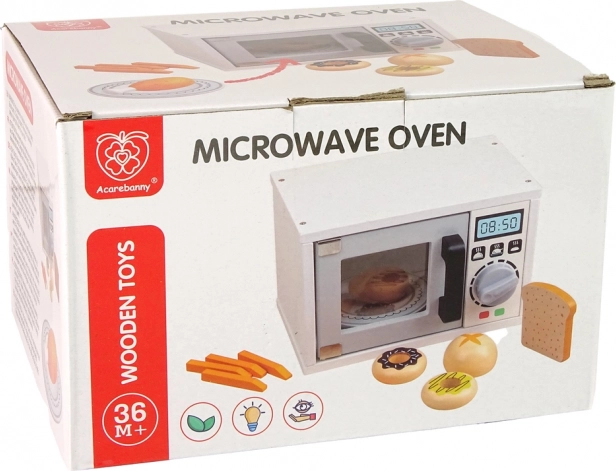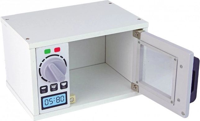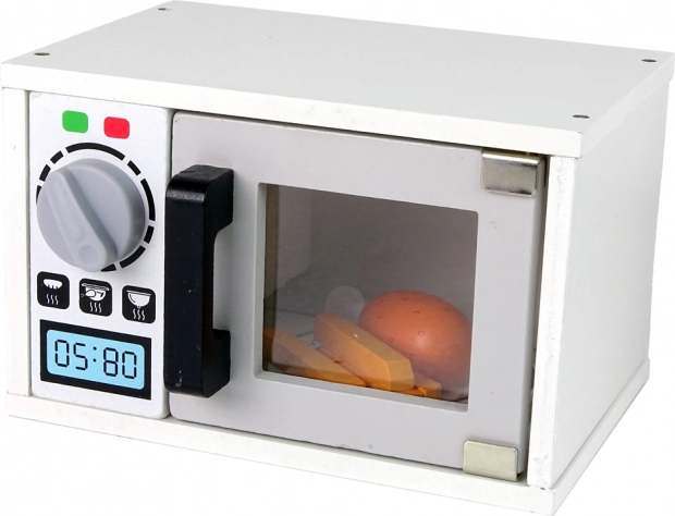 Elegante forno a microonde in legno di colore bianco, l'accessorio perfetto per ogni cucina dei bambini. Favorisce il gioco di ruolo, ha sportello magnetico, manopola girevole con clic e arriva con ricchi accessori. Realizzato in legno di alta qualità e verniciato in modo sicuro secondo le norme CE ed EN 71, adatto ai bambini dai 3 anni.