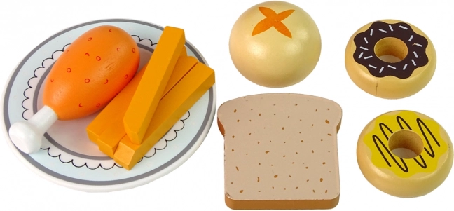 - Accessori ricchi: piatto, 2× donut, panino, fetta di pane, 4× patatine fritte, coscia di pollo