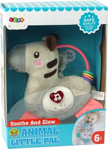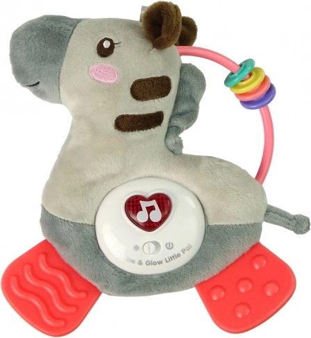 La zebra interattiva in soffice peluche offre ai bambini divertimento e relax. Il cuoricino luminoso avvia le melodie e cattura l’attenzione, mentre i morbidi massaggiagengive sulle zampette alleviano il fastidio della dentizione. Quattro anelli colorati sul dorso funzionano come sonaglio e sviluppano le abilità di presa e manipolazione.