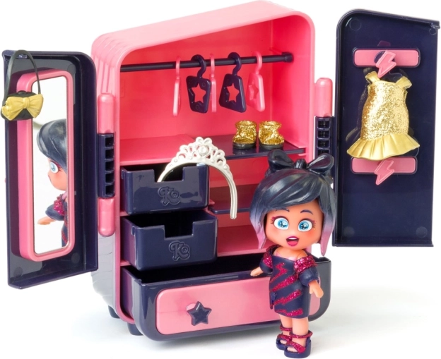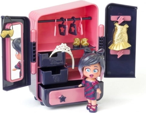1× bambola esclusiva, 2× outfit, scarpette e accessori, appendini + cassetti, 3× adesivo