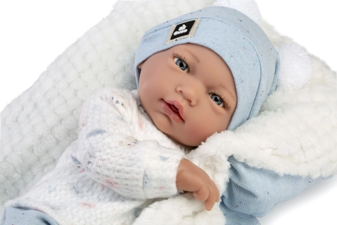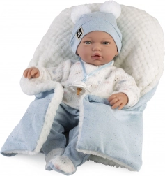 Bambola realistica neonato con corpo in tessuto morbido, facilmente posizionabile. Le braccia e le gambe sono attaccate con giunture, il che permette alla bambola di sedersi. Fornita con ciuccio come accessorio.