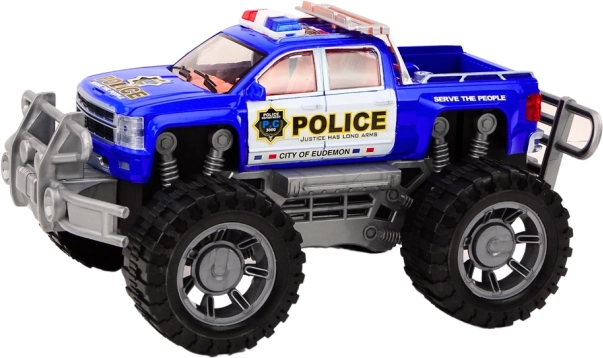 Il veicolo è dotato di grandi ruote fuoristrada nere che garantiscono un’eccellente aderenza su diverse superfici e permettono di giocare in condizioni più impegnative. La carrozzeria è verniciata di blu e, per maggiore autenticità, è decorata con la scritta "POLICE". Sul tetto sono installate le sirene della polizia, che ne esaltano funzione e aspetto.