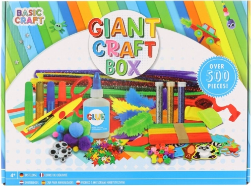 Il grande set di creatività include perline, occhi mobili, stelline colorate, carta crespa colorata, colla, colle colorate con glitter, glitter, palline di stoffa pelose, forbici con bordo ondulato, piume colorate, bastoncini colorati e fil di ciniglia colorati. La confezione contiene in totale oltre 500 pezzi. Confezionato in scatola. Dimensioni della confezione ca. 40×30×5 cm. Età 4+