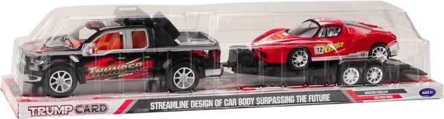 Il pickup con grandi ruote nere traina con sicurezza il rimorchio con l’auto sportiva e, grazie al meccanismo a frizione, dopo la carica avanza senza batterie. Il rimorchio sganciabile permette di cambiare rapidamente gioco: i bambini possono trasportare l’auto oppure giocare con ciascun modello separatamente. L’auto sportiva rossa colpisce per le linee eleganti e si può caricare e scaricare con facilità.