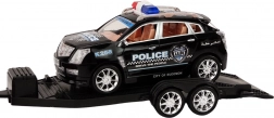 Sul rimorchio c'è un veicolo fuoristrada della polizia nero, che presenta anch'esso sulla carrozzeria la scritta "POLICE". Questa auto è progettata per apparire robusta e pronta all'azione, quindi è ideale per interpretare diversi scenari polizieschi.