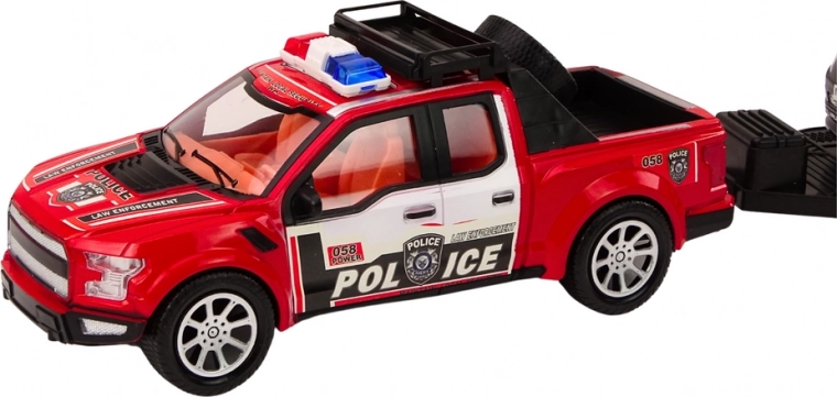 Il pickup rosso è dotato di grandi ruote nere che garantiscono stabilità e facilitano il traino del rimorchio con l'auto fuoristrada. Il pickup ha un design realistico e sulla carrozzeria porta la scritta "POLICE", che gli conferisce autenticità.