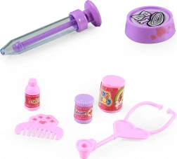 Il set include vari strumenti, come siringhe, pettine, stetoscopio e altri, tutti in diversi colori. Perfetto per simulare le cure degli animali.