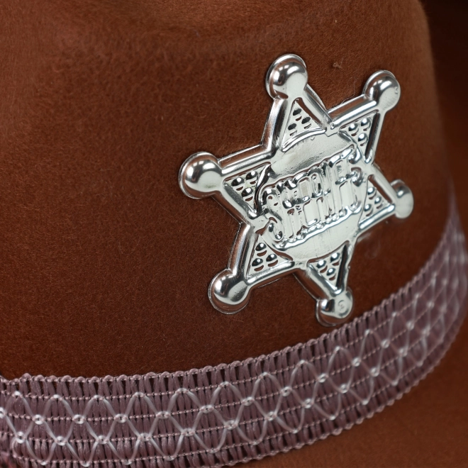 Trasforma in un attimo il piccolo cowboy in uno sceriffo. Il cappello marrone con nastro elegante e brillante stella da sceriffo resta ben saldo grazie all'elastico, così calza alla perfezione anche durante il gioco più movimentato.
