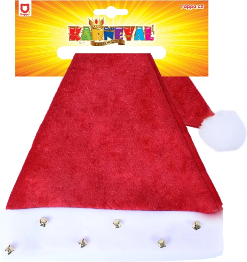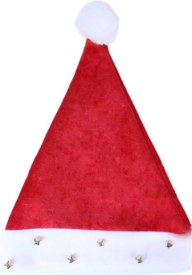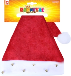 Cappello natalizio elegante con bordo bianco, decorato con campanelli e un pon pon. Ideale per le feste di Natale.