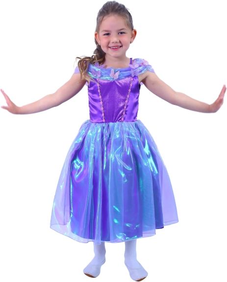 Questo costume da principessa viola trasforma ogni bambina nella stella di qualsiasi festa. Materiali delicati e scintillanti, dettagli floreali e di farfalle e una leggera gonna a strati esaltano il look fiabesco, confortevole da indossare tutto il giorno.