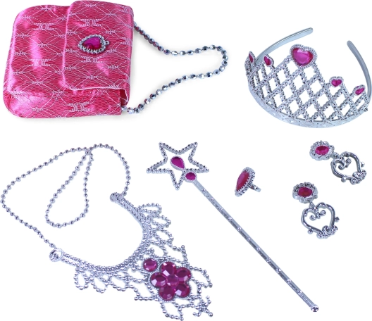 Accendi la fantasia dei bambini con un incantevole set da principessa che trasforma ogni bambina in una vera principessa. Nella confezione trovi corona, orecchini, collana, bacchetta magica e borsetta nel bellissimo colore rosa – ideale per travestimenti, carnevale e giochi in casa.