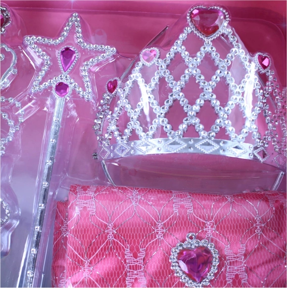 Contenuto della confezione: corona, orecchini, collana, bacchetta magica, borsetta.