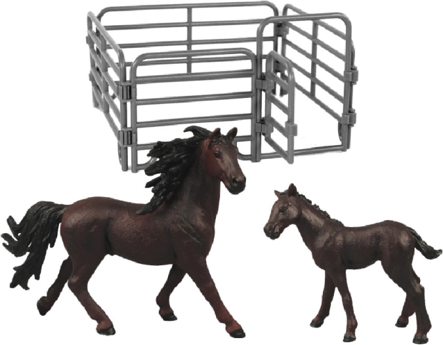 Arricchisci la tua collezione di giocattoli con questo bellissimo set di cavalli con recinto. La figura del cavallo e del puledro hanno un aspetto realistico e con la loro fattura soddisfano tutte le fasce d'età. La confezione contiene: