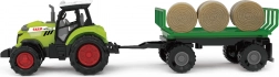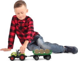 Moderno trattore in plastica con rimorchio e balle di fieno della collezione La mia piccola fattoria offre suoni realistici, effetti luminosi e ruota libera per una guida fluida. Il rimorchio può essere facilmente sganciato e le balle rimosse comodamente. Nella confezione sono incluse le batterie AG13/LR44.