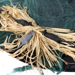 Il cappello è decorato con tulle verde e ragnetti, creando un look spaventoso e allo stesso tempo elegante.