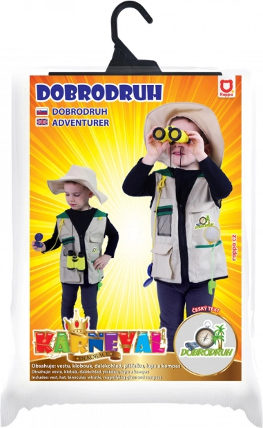 Parti per una spedizione di scoperta con il costume del piccolo avventuriero per bambini 3–7 anni (104–134 cm). Il set include un gilet e un cappello e pratici accessori binocolo, lente d'ingrandimento, fischietto e bussola con stampa in ceco – ideale per carnevale, feste in maschera e giochi da esploratore.