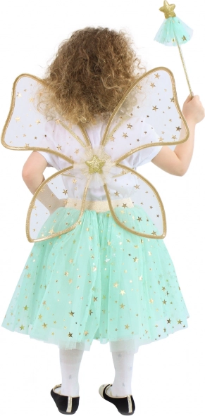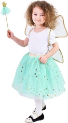 Il costume include una splendida gonna verde con stelle dorate, completata da ali abbinate e bacchetta per un'esperienza fiabesca perfetta.