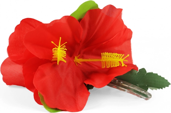 Il fiore di ibisco realizzato in tessuto combinato con plastica appare molto realistico e ravviva qualsiasi acconciatura.