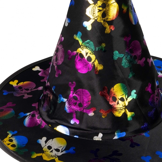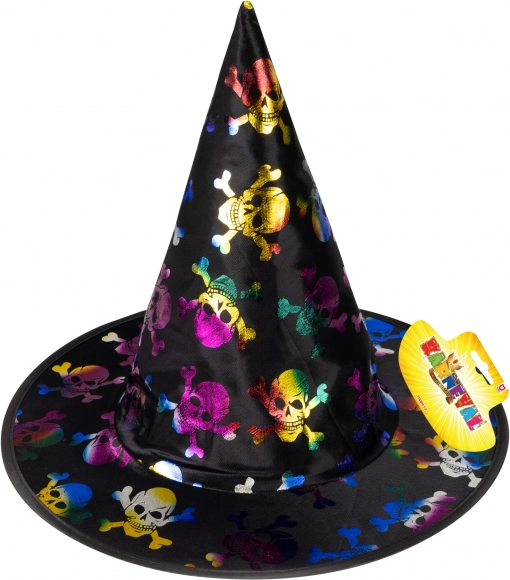 Crea un costume indimenticabile con questo cappello nero con motivo di teschi colorati. È perfetto per travestimenti da strega e di Halloween e si abbina facilmente a mantello, abito o maschera. Grazie alla taglia per bambini calza alla grande e valorizza ogni trasformazione spettrale o fiabesca.