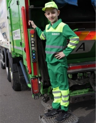Questo costume è ideale per ogni piccolo appassionato di camion della spazzatura! Viene fornito in un set che comprende giacca con scritta, berretto e pantaloni, tutti con elementi riflettenti per una migliore visibilità.
