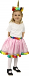 Gonna rosa con bordo satinato arcobaleno è il pezzo centrale del costume, che cattura immediatamente l'attenzione.