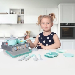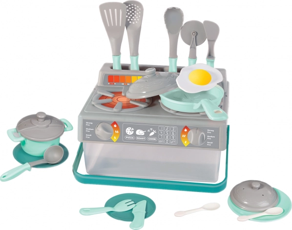 Questo set cucina per bambini in colore grigio e turchese contiene tutto ciò di cui i bambini hanno bisogno per giocare a fare i cuochi. Il set include: