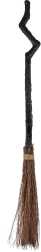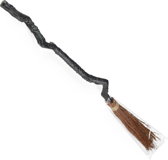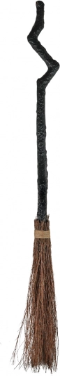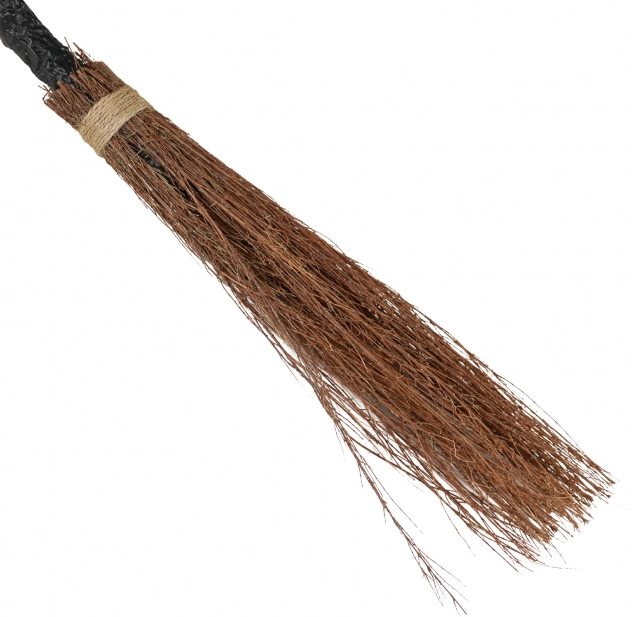 Scopa con manico nero e parte spazzante marrone che richiama il classico oggetto da strega.