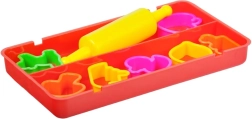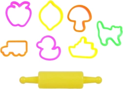 Il set comprende colorate formine in plastica di varie forme e un leggero mattarello giallo, con cui i bambini possono stendere e ritagliare motivi perfetti con facilità.