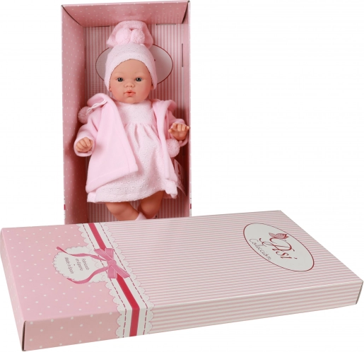 La bambola indossa un elegante completo rosa: abitino lavorato a maglia, caldo cappottino con chiusura a fiocchetti pompon, cuffietta a maglia e morbidi calzini. È confezionata in un’elegante scatola regalo, ideale come regalo per bambini dai 3 anni.
