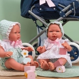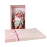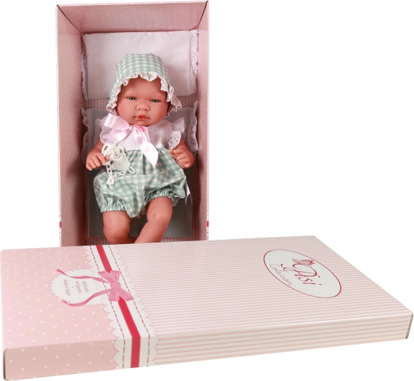 Pablo indossa una salopette estiva verde e bianca senza maniche con pantaloncini corti, decorata con pizzo bianco, abbinata a un cappellino con laccetti. È adagiato su un morbido cuscino con copertina e ha un ciuccio con catenella che si inserisce in bocca e rimane ben saldo. Il produttore ASI (Asivil) è un marchio familiare spagnolo con oltre 50 anni di tradizione, che punta su artigianalità 100% locale e rigorosi standard europei.