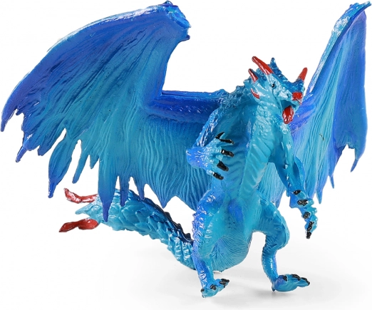 Drago dettagliato blu con grandi ali spiegate e accenti rossi su viso e coda.