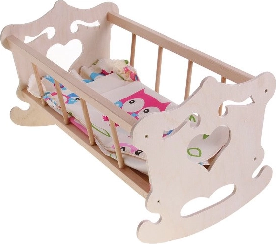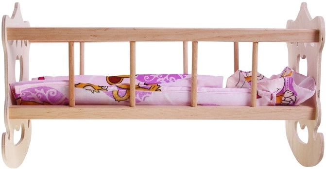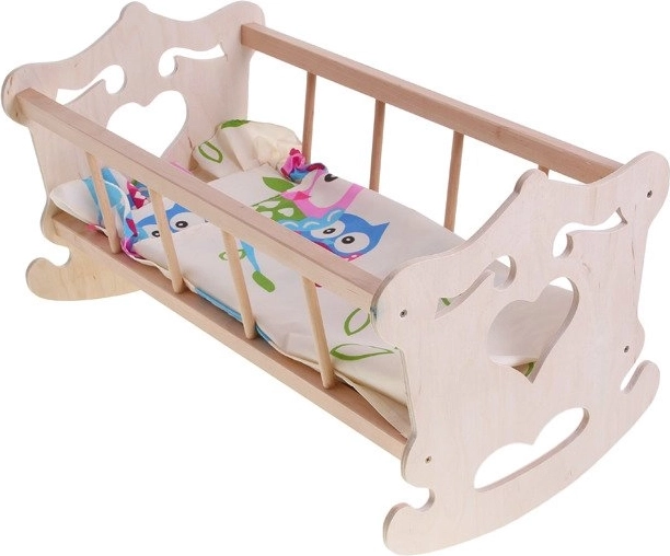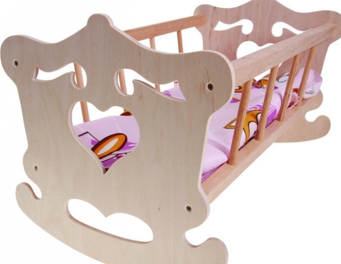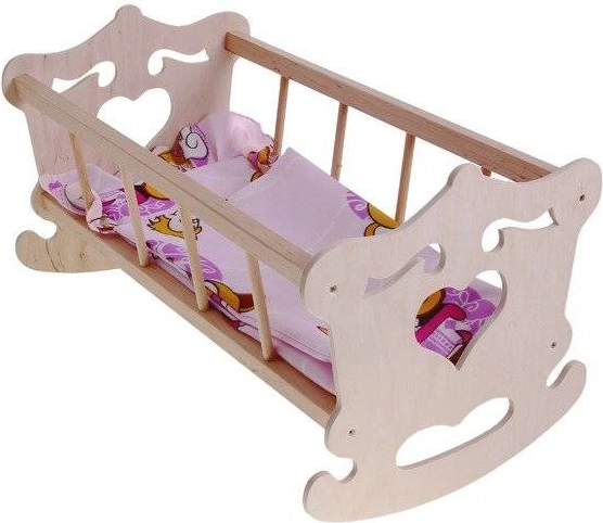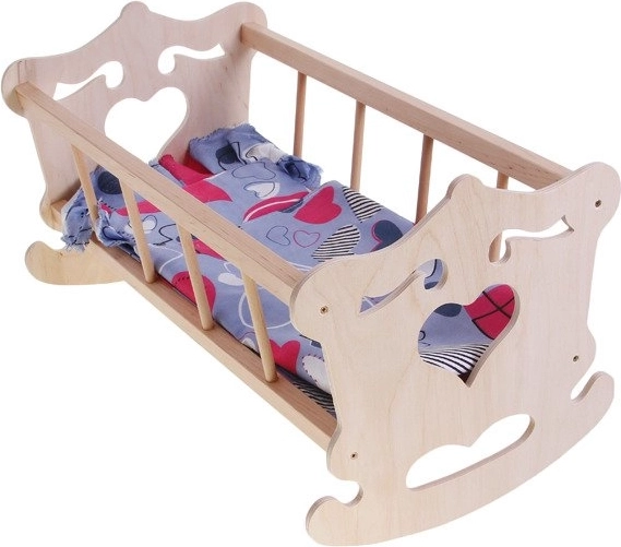 Culla in legno per bambola con altezza massima di 50 cm e biancheria colorata, perfetta per ogni piccola mamma.