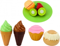 Il set include una pizza divisa in 4 parti che i bambini possono comporre e servire sul vassoio incluso. Il tagliapizza consente un “taglio” realistico e rende il gioco più autentico. Uno snack preferito che suscita sempre grande interesse. Le patatine possono essere servite come contorno. Il set contiene due gelati, ideali come dessert dopo un pasto gustoso. I gelati sono colorati e realizzati in modo realistico.