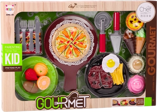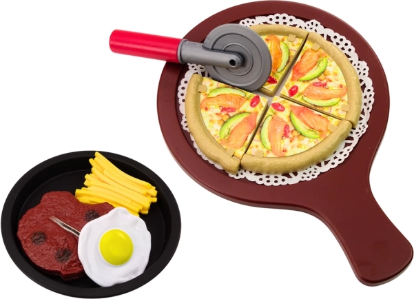 .Il set include una pizza divisa in 4 parti che i bambini possono comporre e servire sul vassoio incluso. Il tagliapizza consente un “taglio” realistico e rende il gioco più autentico. Uno snack preferito che suscita sempre grande interesse. Le patatine possono essere servite come contorno. Il set contiene due gelati, ideali come dessert dopo un pasto gustoso. I gelati sono colorati e realizzati in modo realistico.