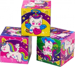 Il giocattolo è un cubo puzzle magico che trasporta i bambini nel mondo di dolci unicorni e del divertimento. Ogni faccia del cubo è decorata con motivi di unicorni e colori, e ciascuna faccia contiene 9 riquadri.