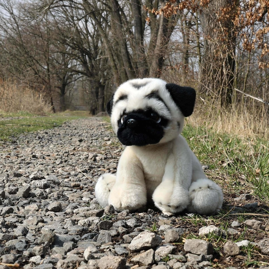 Riproduzione fedele del carlino con orecchiette e nasino neri, pelo soffice per il massimo comfort nelle coccole.