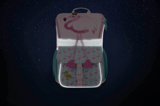 Cartella scolastica imbottita con sistema di schienale regolabile e elementi riflettenti per la sicurezza del bambino.