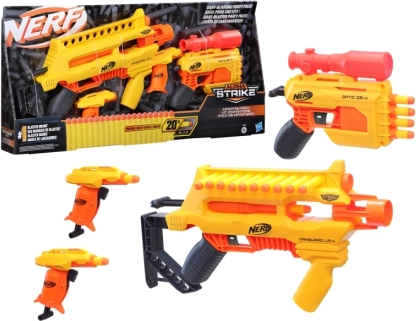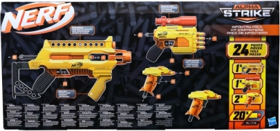 Scopri il brivido del gioco con i blaster Nerf Alpha Strike. Questo set include 4 blaster e 20 freccette ufficiali Nerf Elite, ideale per battaglie avventurose con amici e famiglia.