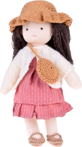 La bambola indossa tonalità rosa e beige: ha un vestito a righe, un cardigan lavorato a maglia, un cappellino, scarpine coordinate e una piccola borsetta. I lunghi capelli scuri e i dettagli curati conferiscono alla bambola un fascino unico. L'elegante scatola di cartone la rende un regalo perfetto per compleanni e Natale.