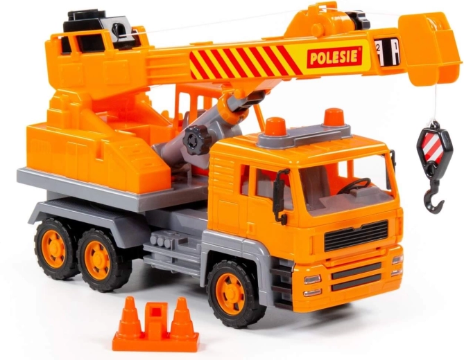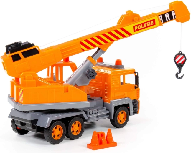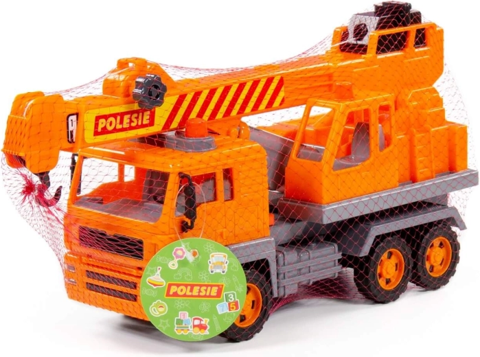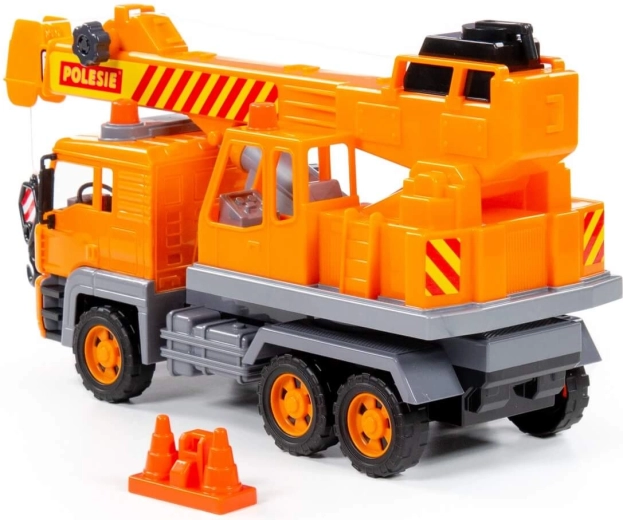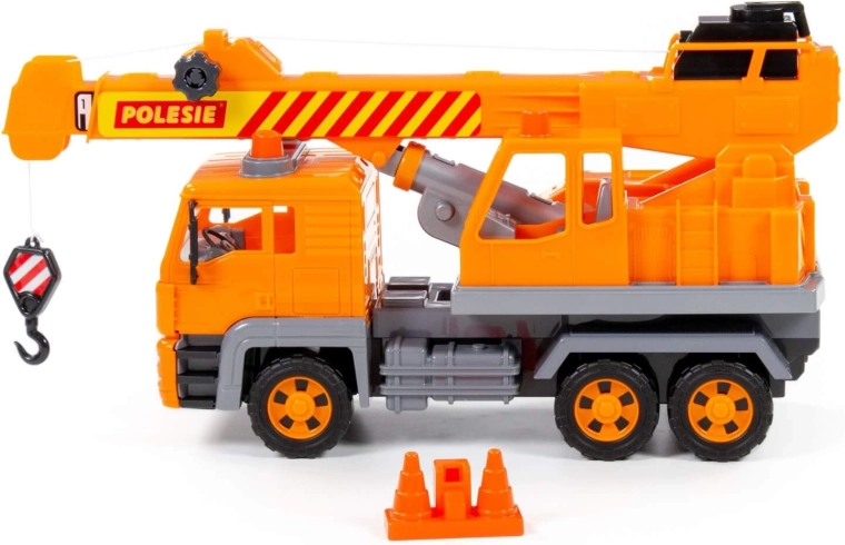 La serie di macchine speciali "Diamante" a volano del produttore Polesie comprende i principali tipi di veicoli utilizzati nella vita reale in varie occasioni di lavoro. I veicoli hanno un aspetto realistico con attenzione ai dettagli: sono presenti imitazioni di fari, luci lampeggianti e tre coppie di ruote su assi metallici. L’autogru è dotata di una piattaforma girevole e di un braccio telescopico con gancio sospeso. Il gancio può essere sollevato e abbassato tramite un meccanismo manuale. Il giocattolo include inoltre coni da cantiere che rendono il gioco più vario e completo.