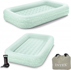 Il materasso gonfiabile Intex con dimensioni 168x107x25 cm è ottimo per i bambini in viaggio - in hotel, campeggi ecc. È realizzato in PVC resistente e ricoperto con un morbido velluto impermeabile di colore verde che si adatta perfettamente a qualsiasi stanza. La valvola Boston consente uno sgonfiaggio facile in un solo minuto, dopodiché il materasso può essere piegato e riposto.