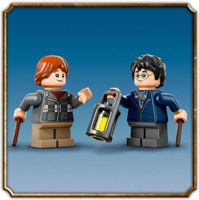 Include minifigure di Harry Potter e Ron Weasley con espressioni sorridenti o spaventate, bacchette e lanterna.