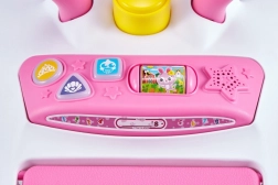 I pulsanti colorati e il rullino con motivi di animaletti riproducono melodie e suoni che favoriscono lo sviluppo dei sensi e della motricità fine.