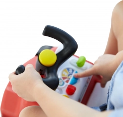 Il volante con clacson e comandi colorati sostiene il gioco di fantasia e la motricità fine. La maniglia posteriore funge da appoggio per i più piccoli durante l’apprendimento della camminata; i più grandicelli apprezzeranno la guida spingendosi con i piedini.